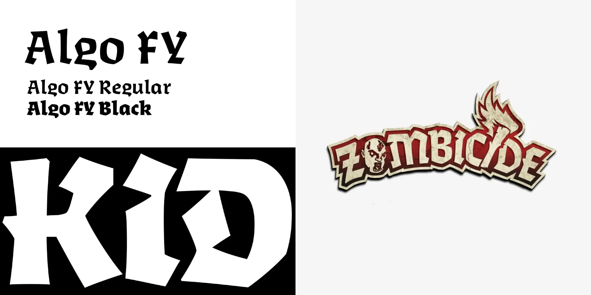 The Zombicide games have incorporated the Algo FY font into their design for the Fantasy Zombicide games. This font is prominently used across various elements such as titles, game cards, manuals, and the Zombicide logo used on the Fantasy games.