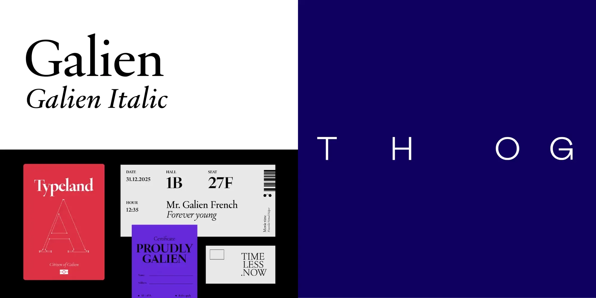 - Quaintly Modern: Galien’s refined serifs, small x-height and long extenders offer a sense of old-style sophistication in a modern typeface, making it ideal for brands looking to make a strong visual impact.