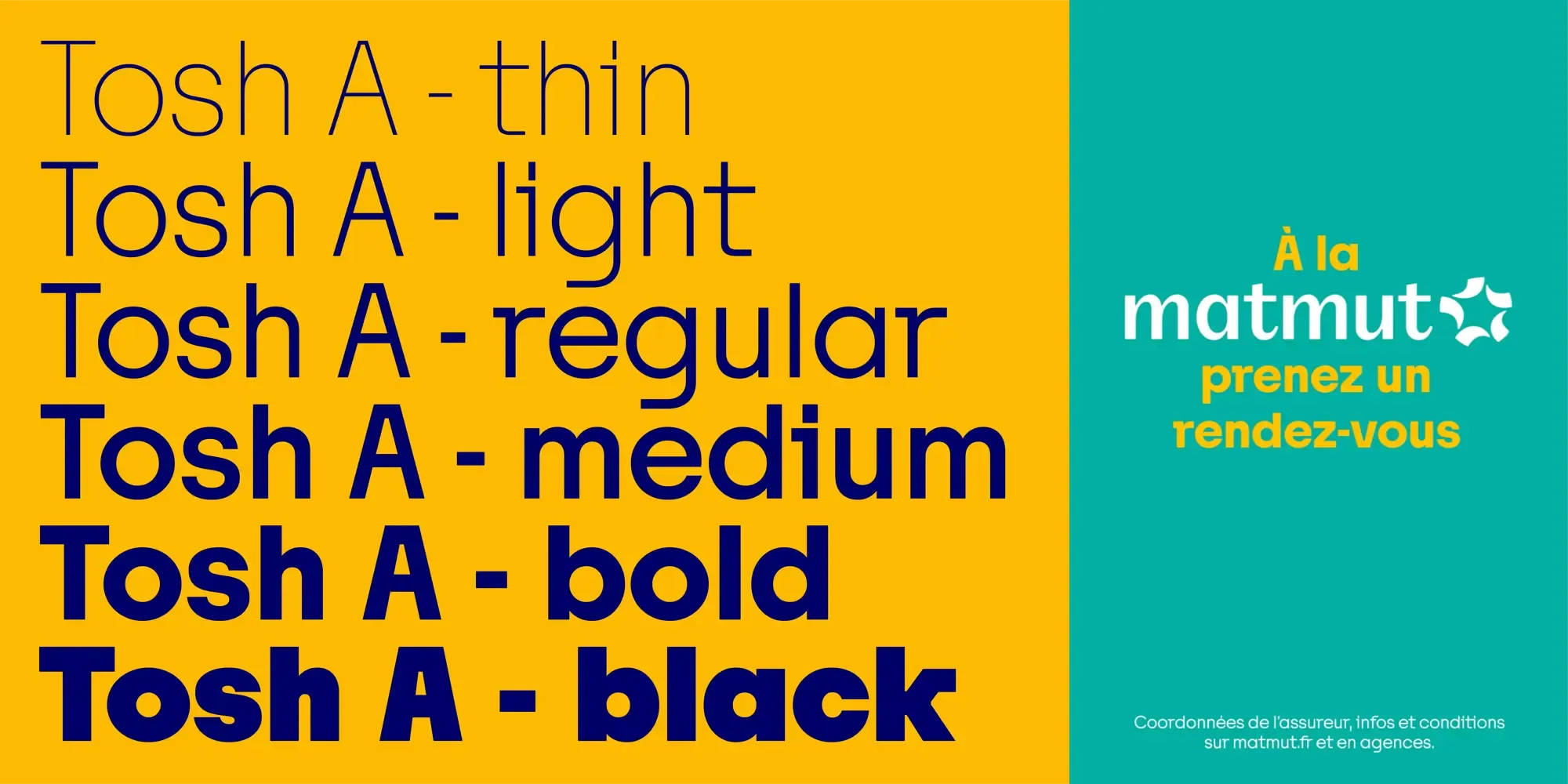 Tosh A gives Matmut a new voice that speaks to clients of all ages, including younger generations. We are very pleased with their choice and implementation of the Tosh typeface.